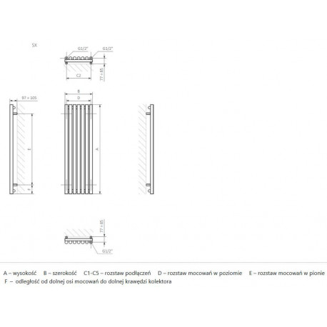 * Konstrukcja: kolektory pionowe o przekroju kwadratu 30x30mm, profile poziome proste i wygięte w kształt litery C, na przemian w sekcjach - rura Ø 22mm.